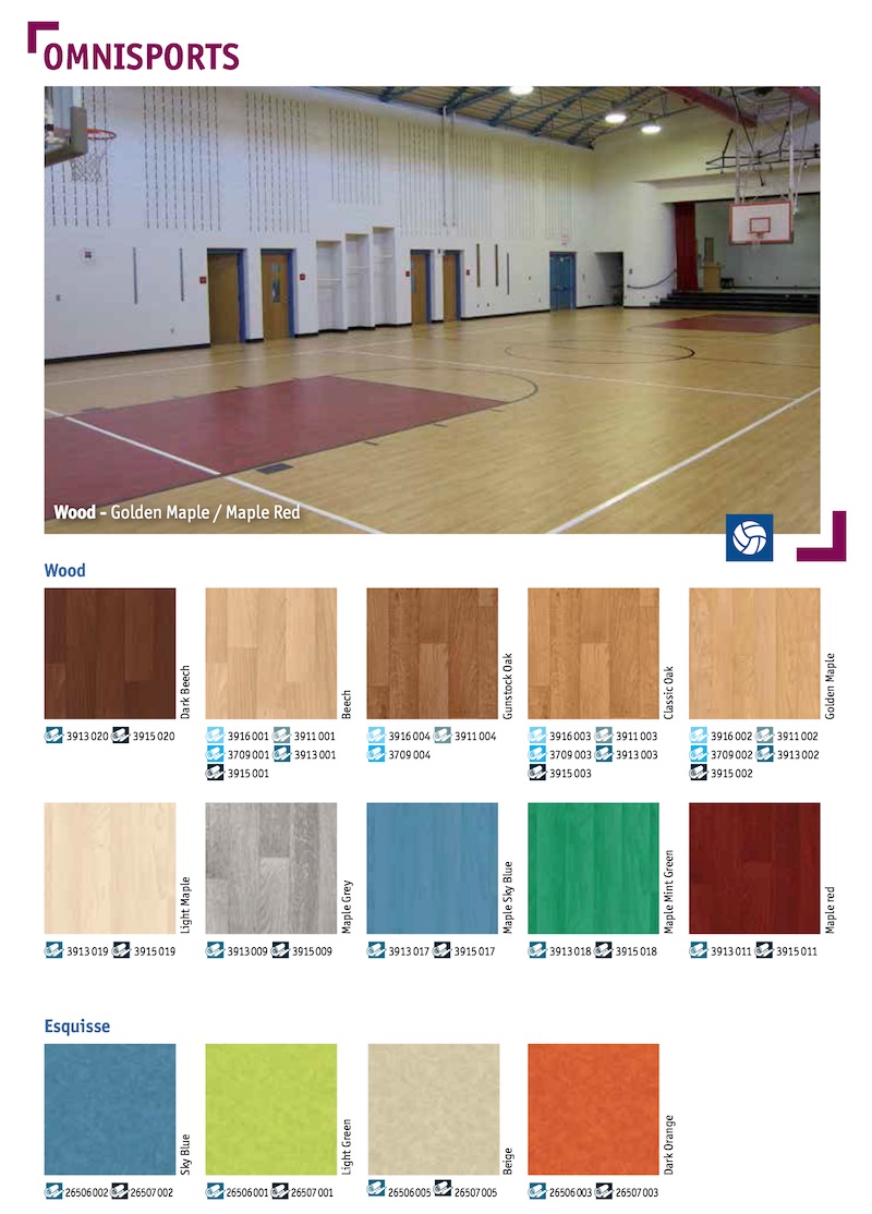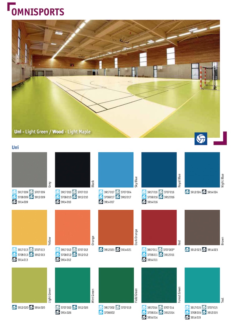 Suitable for school multi sport hall, government own sport hall, real estate facility, sport club center and practice hall. This product can only be applied indoor. Level, smooth and water resistant subbase must be well prepared before applying Tarkett Omnisport sport vinyl product.